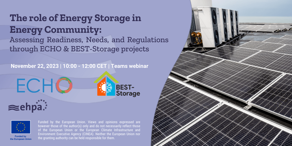 Join us for the live webinar, “The role of Energy Storage in Energy Community: Assessing Readiness, Needs, and Regulations through ECHO & BEST-Storage projects” where we’ll be bringing together experts from the ECHO & BEST-Storage Consortiums and experts coming from the thermal energy sector, to explore together the current situation of energy storage technologies.